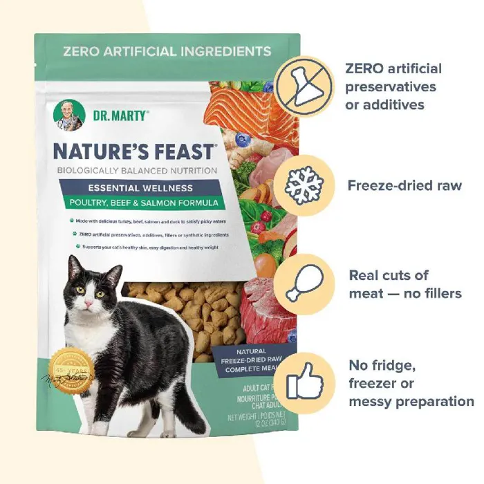Dr. Marty Nature's Feast Essential Wellness Cat Food, is a premium, freeze-dried raw cat food that provides everything your adult cat needs for a stronger, healthier life. This cat food formula is 100% natural and contains feline-friendly fruits, veggies, and mixed proteins to support energy, good digestion, and smooth skin (and a shinier coat!).