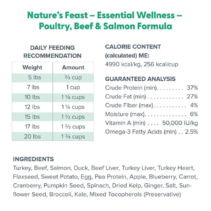 Natures Feast - Essential Wellness- Beef, Salmon, and Poultry, combines premium cuts of meat for protein and omega-3s to support healthy teethand skin, easy digestion, balanced energy, and vital organs- and antioxidants + prebiotics from real veggies, fruit, and seeds to support lasting health.