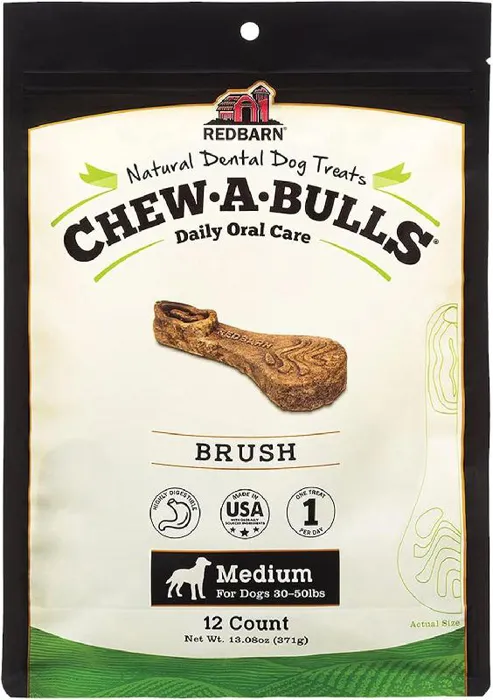 It's time to brush your teeth, but what about your pooch? Easy! Grab a Redbarn Chew-A-Bulls® dental treat for your dog to enjoy. This all-natural, limited ingredient treat comes in a variety of shapes, including hydrant, chip, brush, toad, and more. Fun ridges and grooves scrape your dog's teeth and gums, moving between those hard to reach places to fight tartar and control plaque. Made with rich spices like cumin and antioxidants like parsley, Redbarn Chew-A-Bulls® are easily digestible, highly palatable and the perfect pairing to your pup’s daily dental routine.